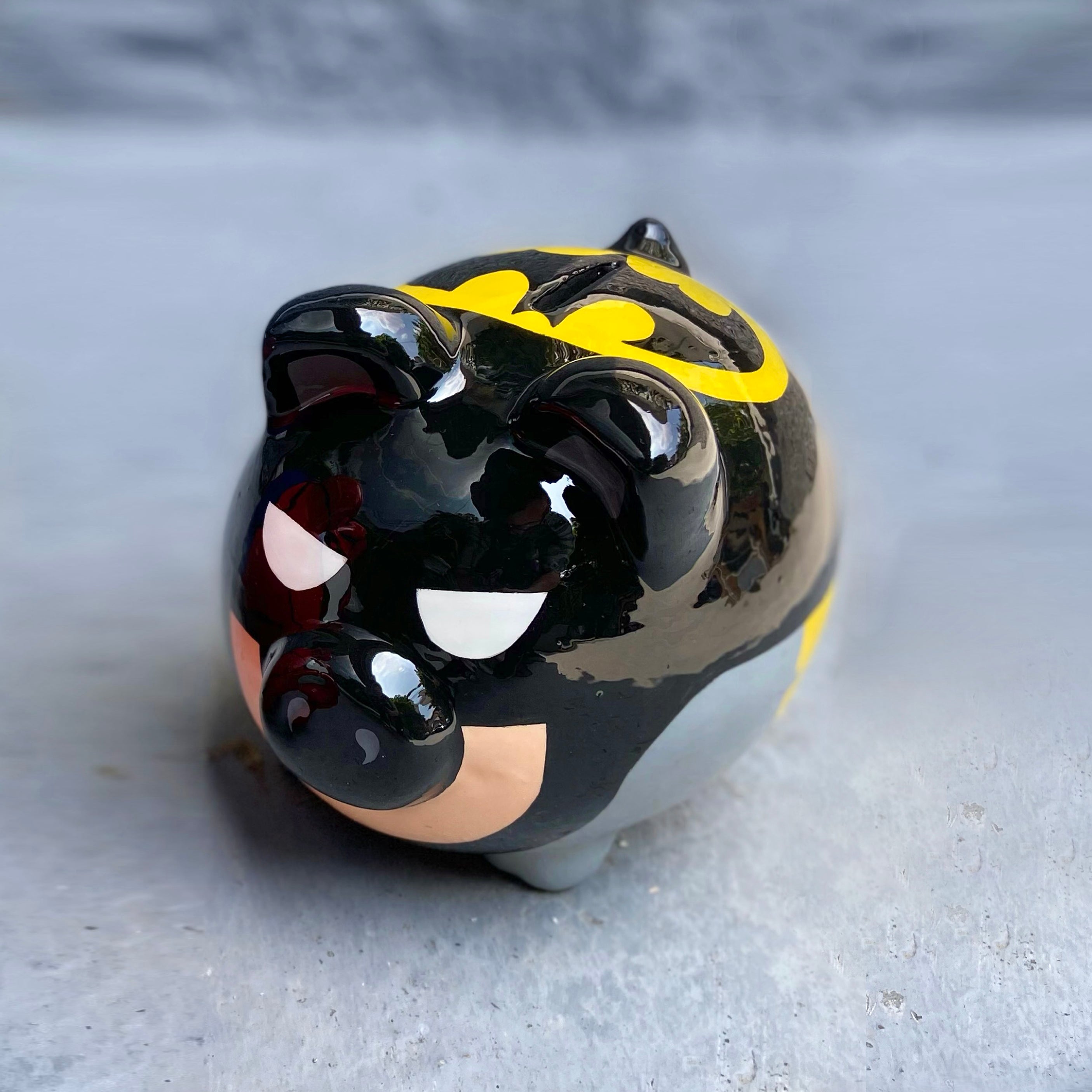 *PRODUCTO DISPONIBLE BAJO PEDIDO, CON DESPACHO 10 DÍAS HÁBILES Alcancía en cerámica en forma de cerdito Batman, pintada completamente a...
